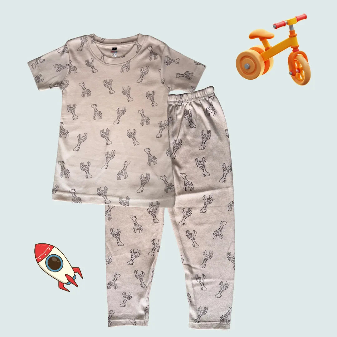 Soft, minimal, and effortlessly adorable – this short-sleeve co-ord set is designed for your little one’s everyday comfort. The set features a matching round-neck top and full-length pants printed with delicate giraffe line illustrations on a warm beige base, creating a calm and earthy look perfect for daily wear.