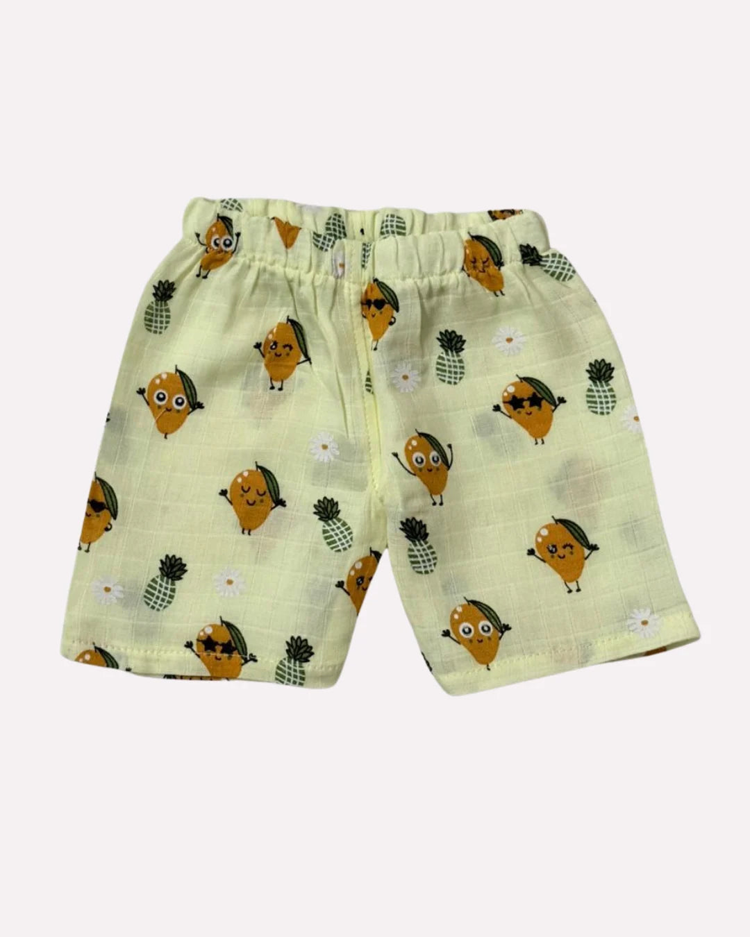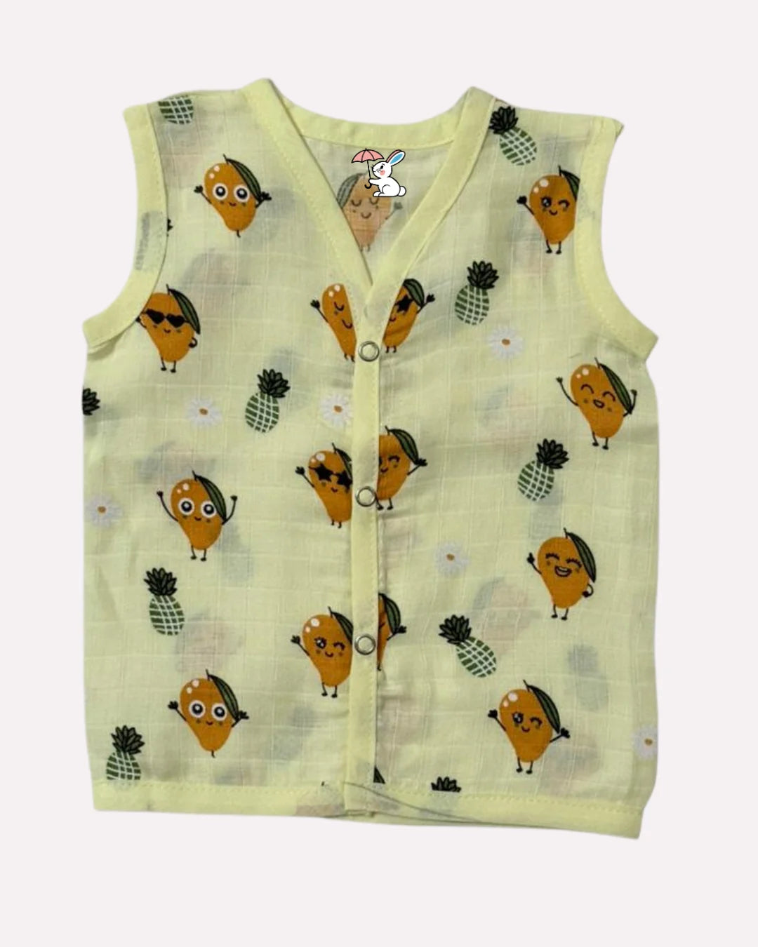Lemon Yellow mango print sleeveless jabla set in 100% pure muslin cotton — ultra-light, breathable, and perfect for summer comfort.