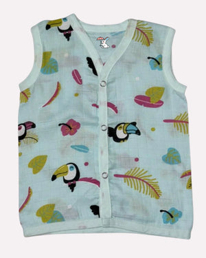 Fresh, vibrant, and perfect for sunny days – this sleeveless jabla co-ord set is designed to keep your little one cool and comfortable. The set features a V-neck button-down jabla paired with matching elastic-waist shorts in a soft mint green shade, beautifully printed with playful toucan birds, tropical leaves, and colorful feather accents.