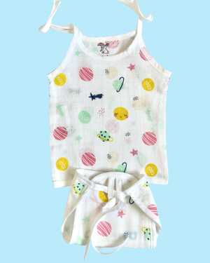 Let your baby shine in comfort with this adorable Tie-Up Jabla and Nappy Set made from 100% pure muslin cotton. Designed on a soft white base with playful planet, star, and space-inspired prints in pastel pink, mint, and yellow shades, this set adds a fun and cheerful touch to everyday wear.