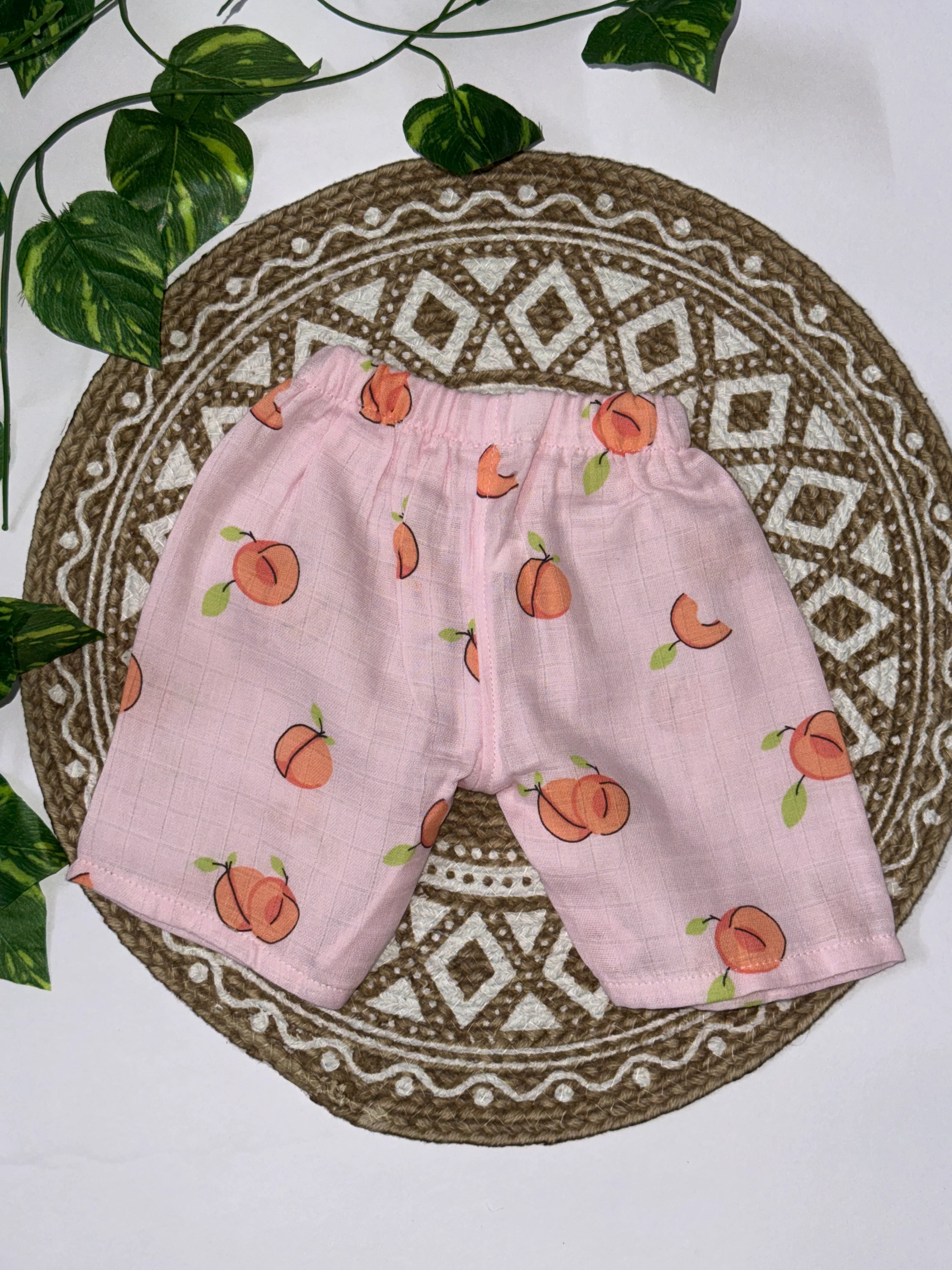 Bring sweet summer vibes to your little one’s wardrobe with this pink muslin cotton peach-print co-ord set.