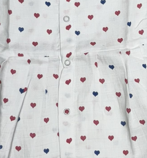 The front open button-down style makes it easy for parents to dress and change their baby, while the frill sleeves add a playful and stylish touch. The heart print design in red and blue creates a cheerful, timeless look.