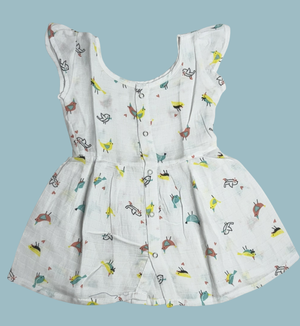 Soft muslin cotton frock with adorable bird prints, featuring frill sleeves and a front-open button design for easy dressing and comfort.
