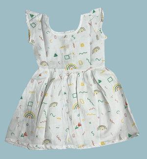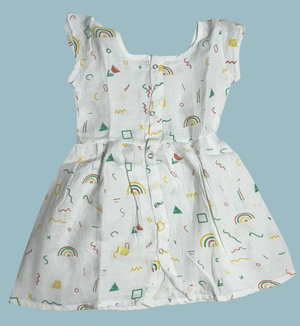 Dress your little one in comfort and charm with our Muslin Baby Frock with Rainbow & Shapes Print. Made from 100% muslin cotton, this frock is ultra-soft, breathable, and gentle on delicate baby skin. The front-open button style with frill sleeves makes dressing easy and fuss-free, while the bright, fun rainbow and geometric pattern adds a cheerful vibe.