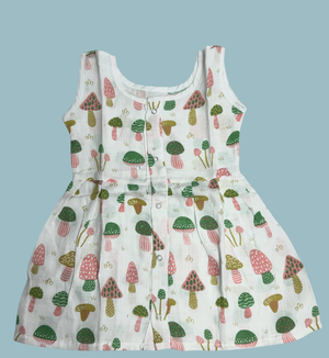 A soft and breathable muslin cotton frock with a playful mushroom print, sleeveless design, and front button opening. Perfect for everyday comfort and style.