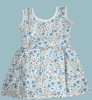 This Muslin Cotton Baby Frock is designed to keep your little one comfortable and stylish. Featuring a cheerful Mickey face outline with stars and rainbow patterns, it brings fun and charm to everyday wear. The sleeveless cut makes it ideal for warm weather, while the front button opening ensures easy dressing and removal.