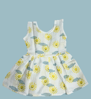 Brighten up your baby’s wardrobe with this adorable Muslin Cotton Baby Frock featuring a playful sun and cloud pattern. The sleeveless cut and front button opening make dressing quick and easy, while the airy muslin fabric keeps your little one cool and comfortable throughout the day.