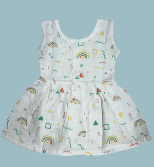 Muslin Cotton Baby Frock – Sleeveless Front Open | Rainbow & Shapes Print